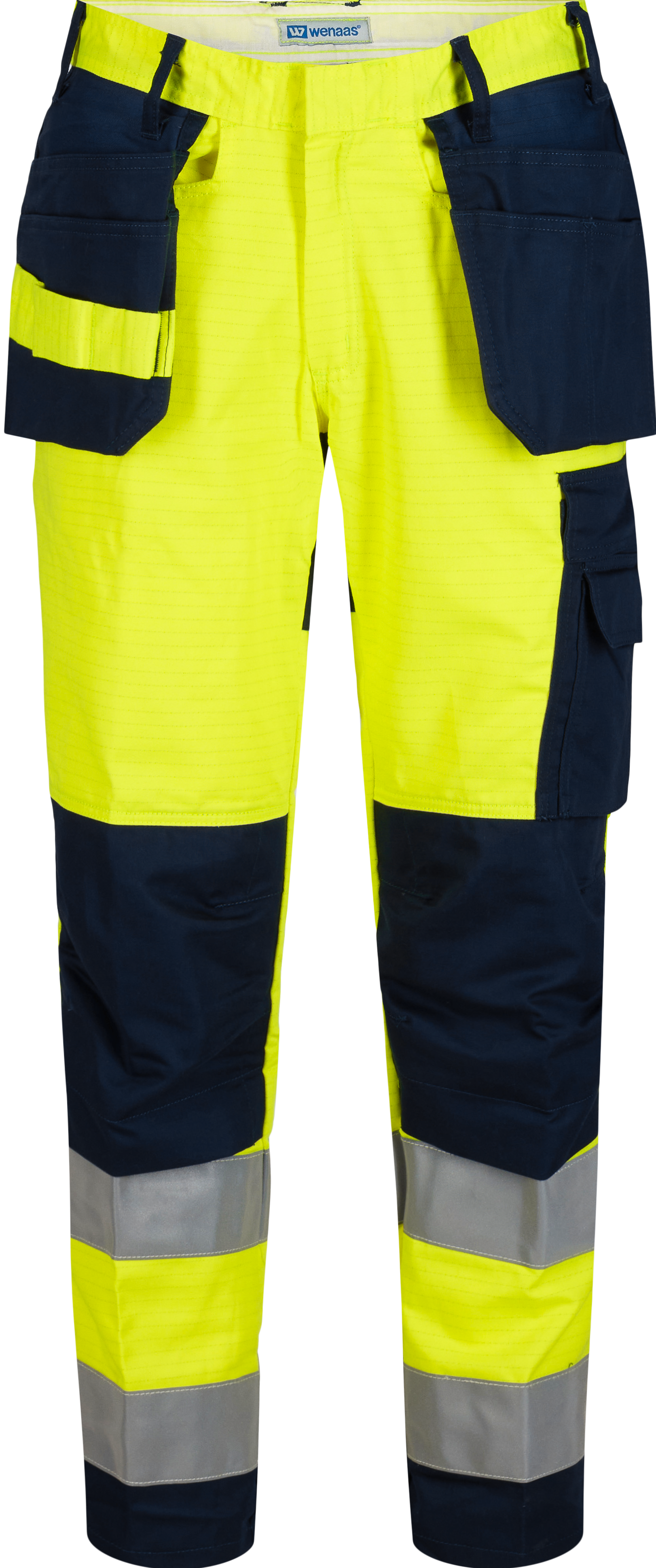 Hängselbyxor med blixtlås i gylfen och plastknapp i linningen, bälteshällor, dubbla avtagbara hängfickor och verktygsögla, sidfickor, bakfickor, dubbel tumstocksficka, fickan är lös nedtill, dubbel lårficka med mobilficka, utvändig ID-kortficka, knäskyddsfickor, och reflexer runt benen.