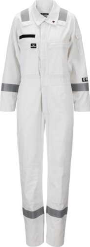 Flamskyddad damoverall med stående krage, tvåvägsdragkedja under frontslå, veck i ryggen, resår i midjan bak och kardborre för namnbrickafäste. Bröstfickor med dragkedja och slå, innerficka, ärmficka med slå, sidofickor med genomgrepp, bakfickor med slå, tumstocksficka och knäskyddsfickar. Reflexband runt ärmar, ben och över axlar. Lätt tyg.