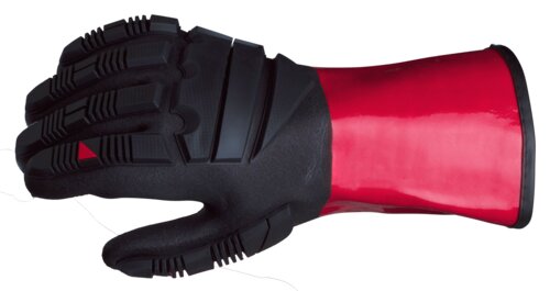 Kraftig kemikalieskyddande handske i nitril. Vattentät, oljesäker och med lång säkerhetsmanschett. Doppad i tre lager nitril-/PVC-blandning och slagskydd på handryggen. Bunt: 3 st. Kartong: 60 st.