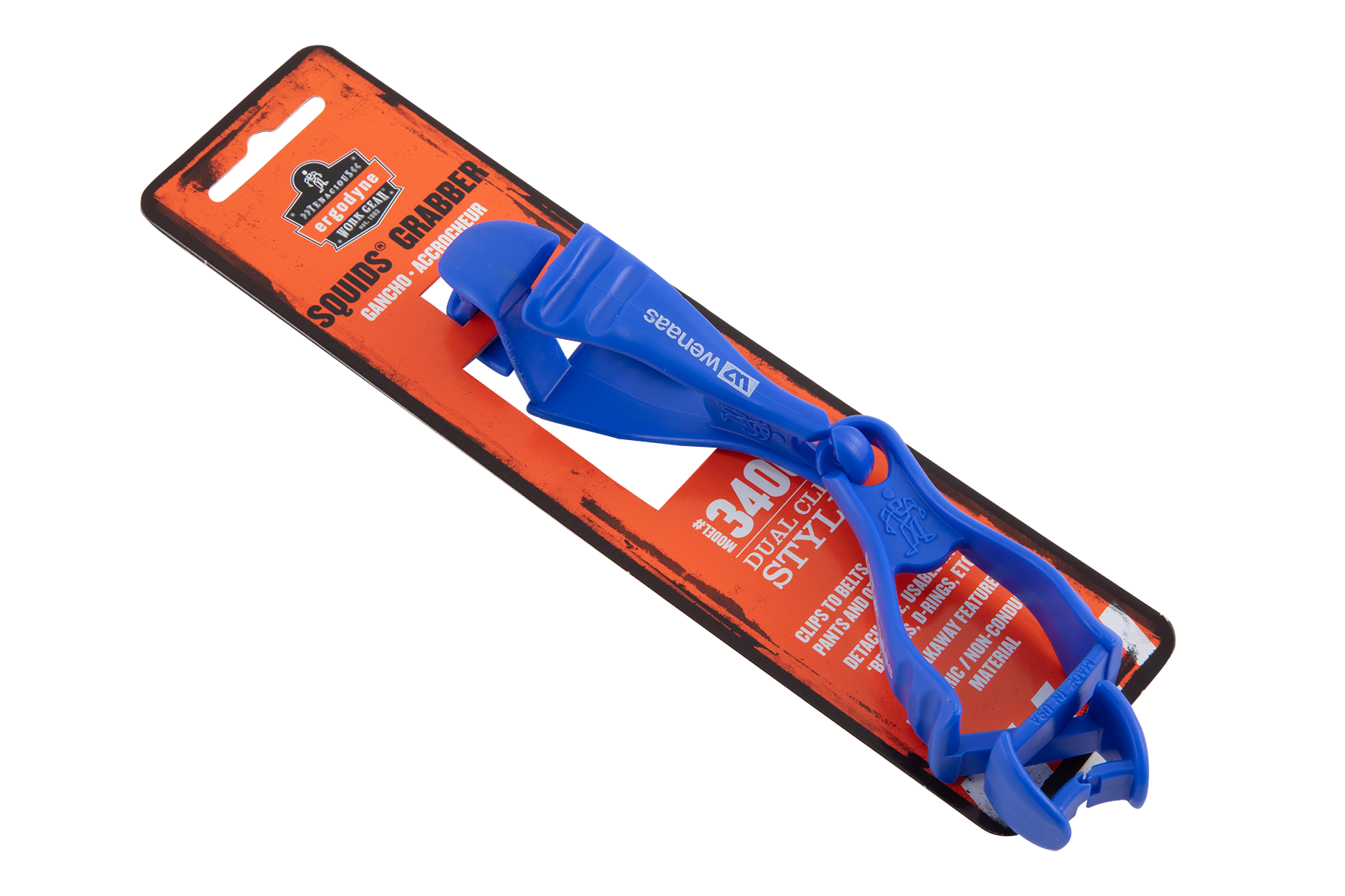 Handskehållare Squids® 3400 håller handskarna säkert på plats genom att klämma fast dem på ett plagg, en D-ring eller annan tillgänglig punkt. Den har ett starkt grepp och en säkerhetsfunktion som gör att den släpper vid nödsituationer för att undvika fastklämning. Den kan sättas ihop igen och återanvändas. Mångsidig dubbelklämma som kan användas som en enhet eller i två delar. Kan även användas till nycklar, handdukar m.m. Brottstyrka: 18 kg.