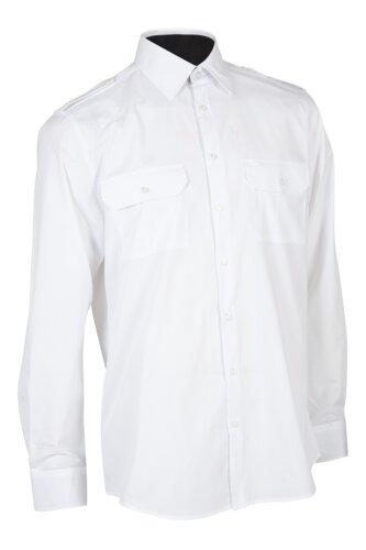 Klassisk långärmad skjorta med spetsig krage, axelklaffar, knappslå fram som stängs med åtta knappar. Bakstycke, insnitt i nederkant på ryggen, långa ärmar med knappslå och justerbara enkelmanschetter. Två bröstfickor med lock och knappar, och pennsöm på vänster ficka. Kontrastfärg på insidan av kragen och manschetten.