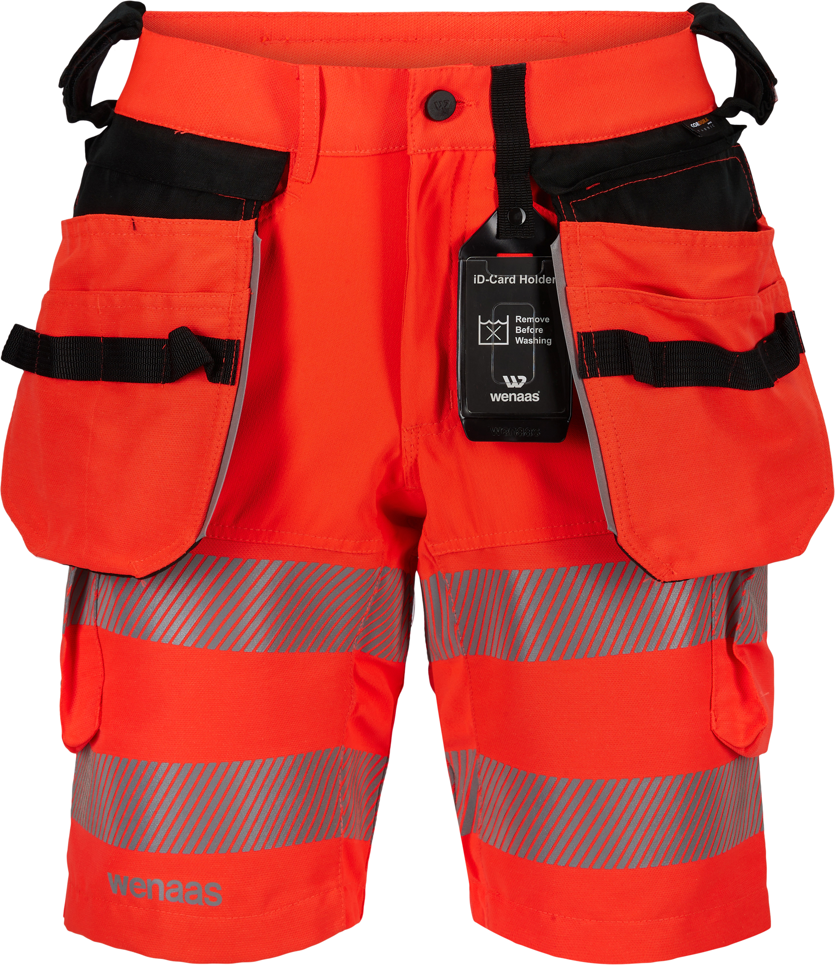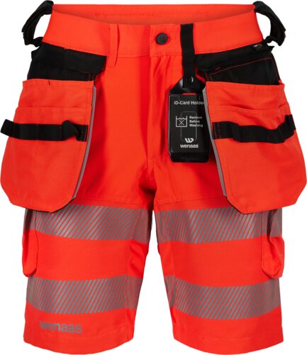 Hivis shorts med bekväm passform, förhöjd linning bak, bältesstroppar och två hammaröglor, avtagbar ID-korthållare, avtagbara hängfickor med verktygsfickor och verktygsöglor, sidofickor, lårficka med klaff, lårficka med dragkedja, bakfickor med dragkedjor samt reflexer med två höjdnivåer på låren.