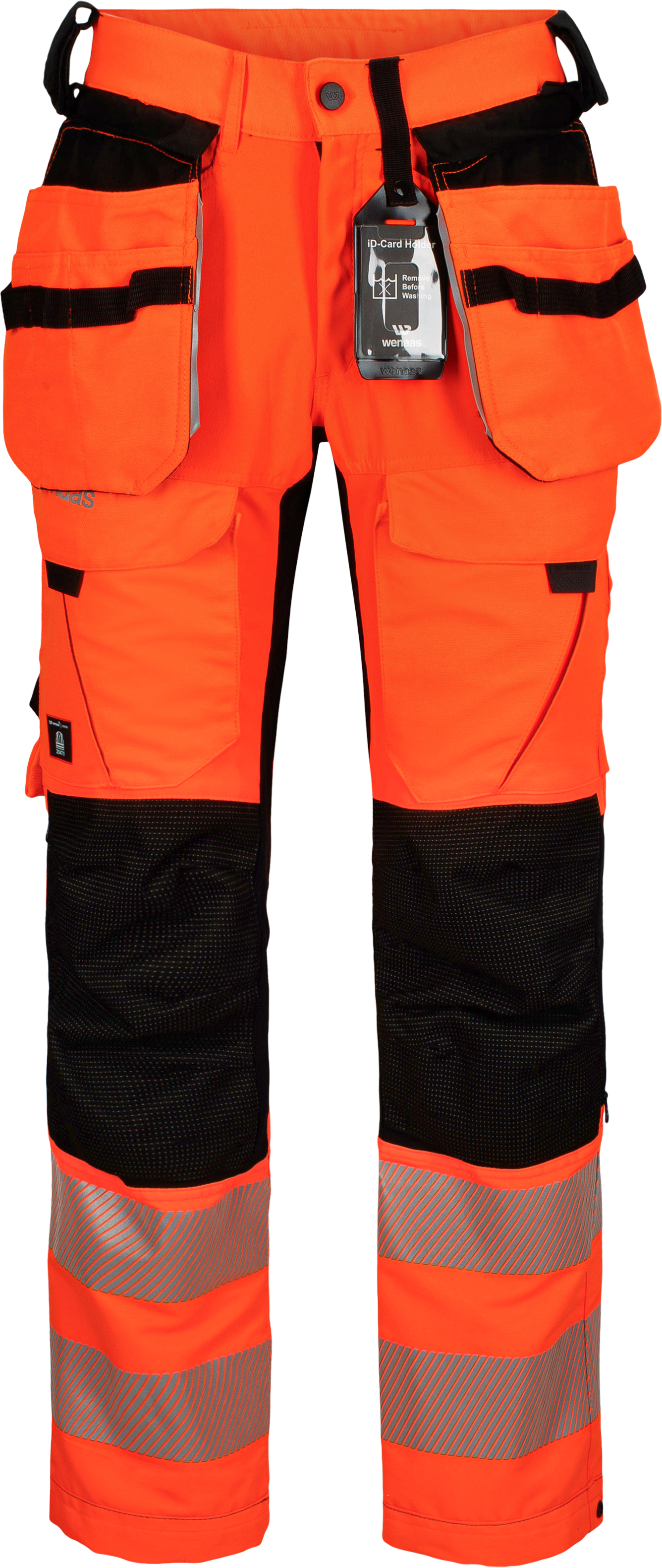 Hivis stretchbyxor med smal passform och ventileringsfält, förhöjd linning bak, bältesstroppar, två öglor för hammare, avtagbara hängfickor med verktygsfickor och verktygsöglor, sidofickor, lårfickor fram, bakfickor, tumstocksficka, mobilficka, knäskyddsfickor med två höjdnivåer, segmenterat reflexmaterial med två höjdnivåer samt längd- och viddjustering i bensluten.