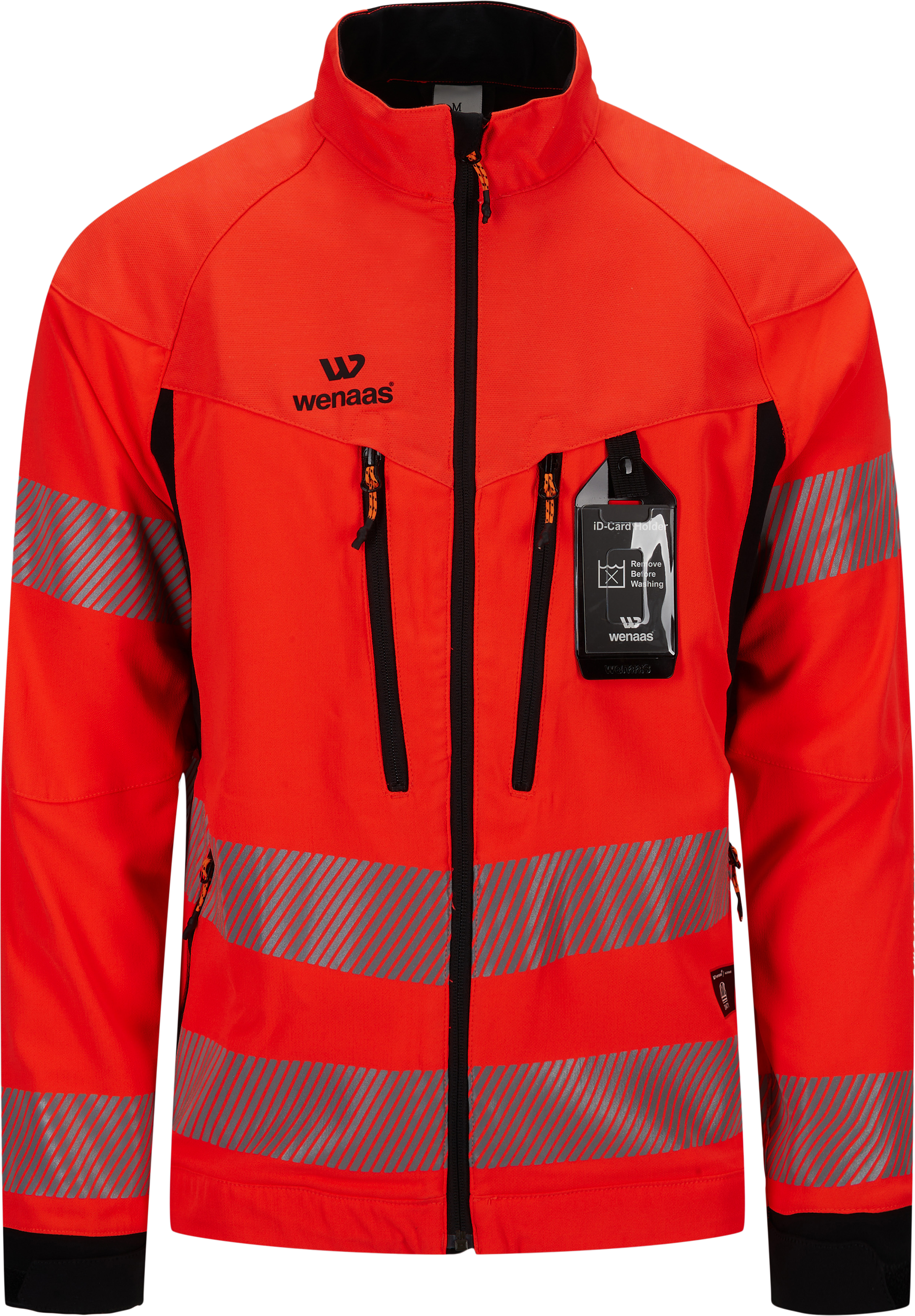 Hivis stretchjacka i herrmodell med ergonomisk passform och ståkrage, dragkedja fram med invändig klaff, förlängd rygg, två bröstfickor med dragkedja, avtagbar ID-korthållare, två framfickor med dragkedja, ventilerande laserhål under ärmarna, förstärkning på armbågar och ärmslut, elastisk manschett med tumgrepp, viddjustering i jackans nederkant och ärmslut, samt reflexer med två höjdnivåer på ärmarna och överkroppen.