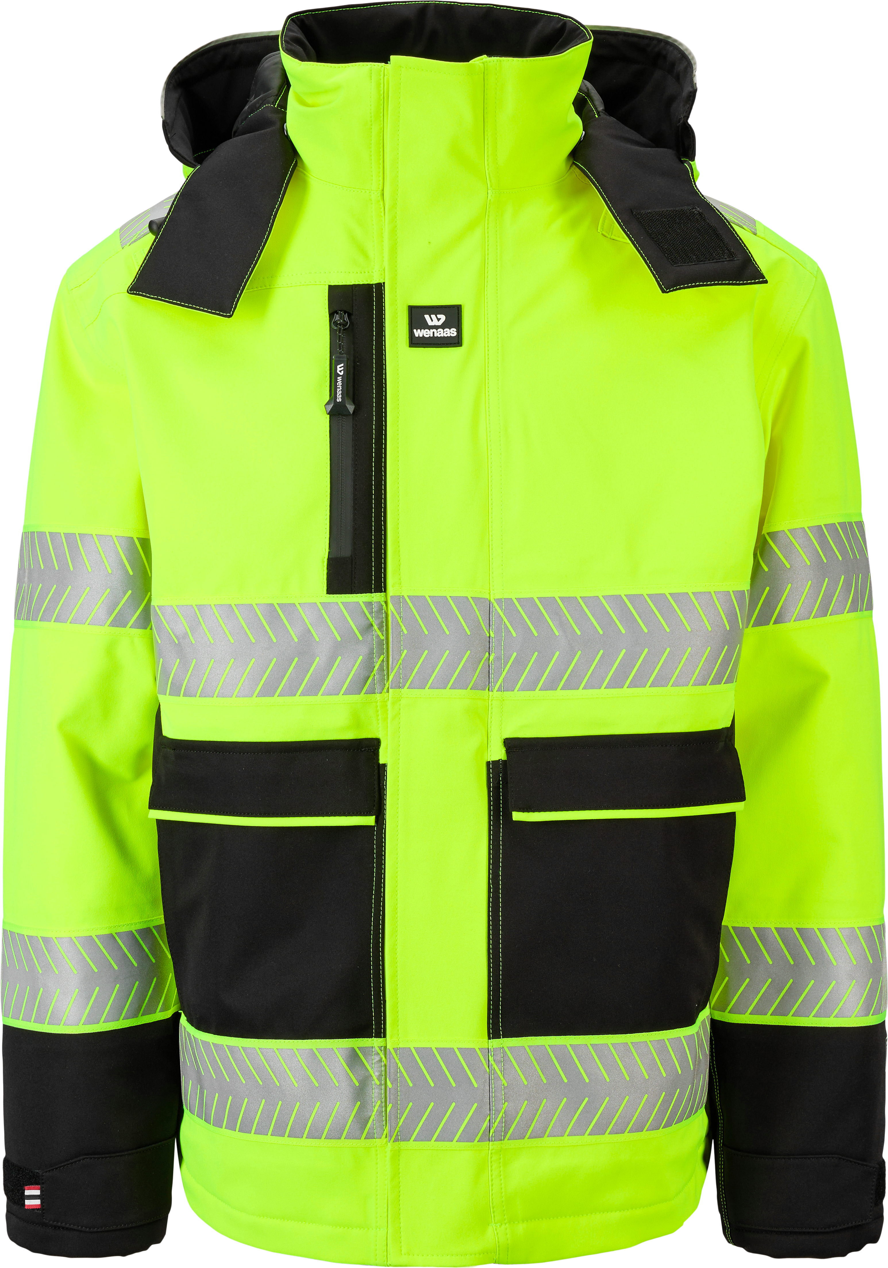 Vattentät vinterjacka godkänd för synbarhetsklass 3. Jacka med stående krage, dragkedjestängning och vadderat foder som håller dig varm i kalla temperaturer. Utrustad med elastiska selar, inspirerade av skidkläder, för flexibilitet och ventilation utan att ta av jackan. Tejpade sömmar ger extra skydd mot väder och vind. Den stora huvan, som kan fästas, passar över hjälmen. Jackan har radioöglor på varje bröst, en kartficka under frontklaffen, en bröstficka på höger sida och framfickor på båda sidor. Nedre fickorna är öppna med elastisk kant upptill för säker förvaring.