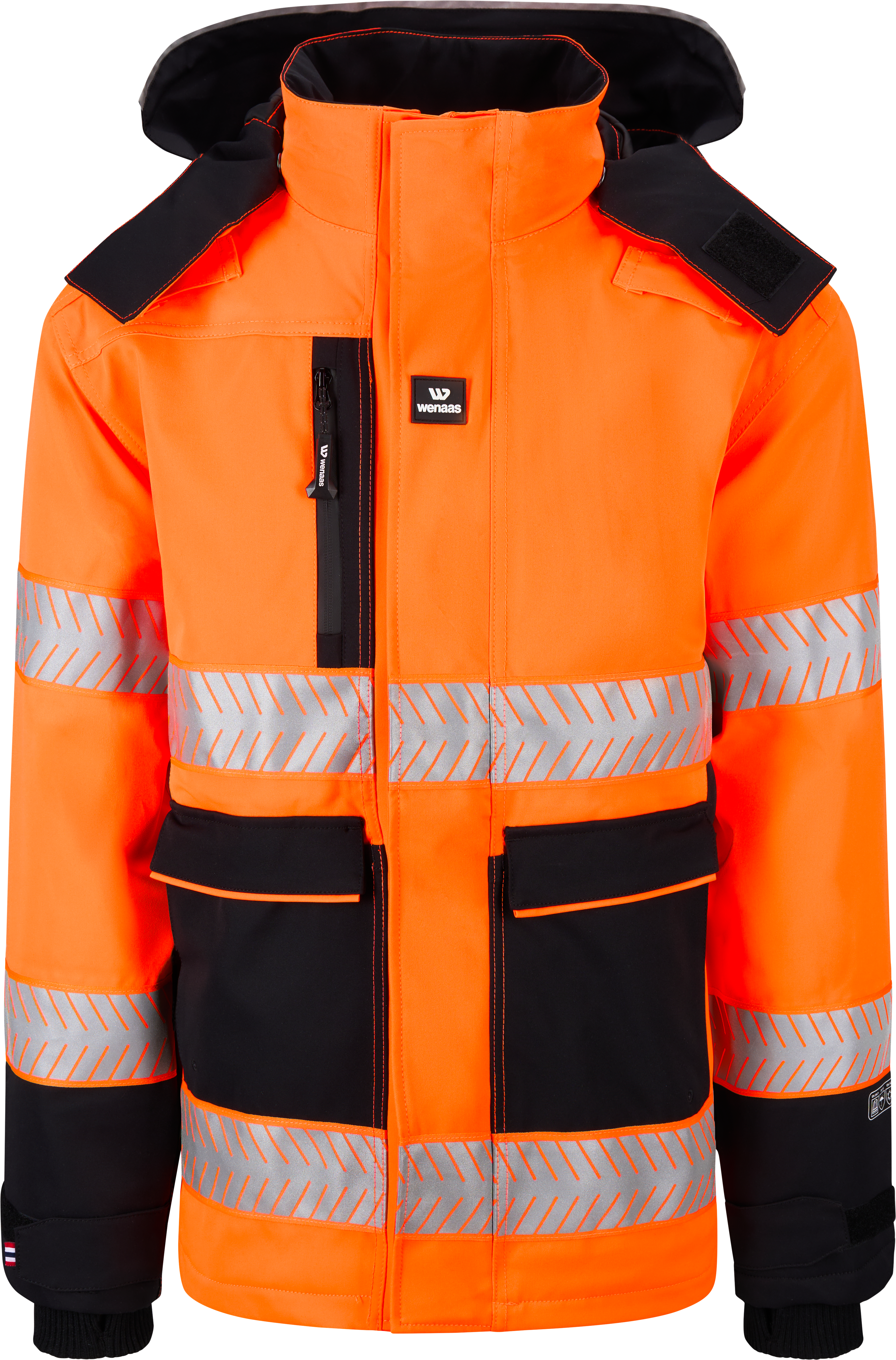 Vattentät vinterjacka godkänd för synbarhetsklass 3. Jacka med stående krage, dragkedjestängning och vadderat foder som håller dig varm i kalla temperaturer. Utrustad med elastiska selar, inspirerade av skidkläder, för flexibilitet och ventilation utan att ta av jackan. Tejpade sömmar ger extra skydd mot väder och vind. Den stora huvan, som kan fästas, passar över hjälmen. Jackan har radioöglor på varje bröst, en kartficka under frontklaffen, en bröstficka på höger sida och framfickor på båda sidor. Nedre fickorna är öppna med elastisk kant upptill för säker förvaring.