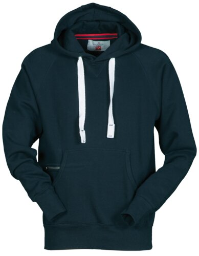 Bekväm huvtröja med fodrad huva och robust dragsko framtill. Tröjan har en stor känguruficka med en invändig praktisk blixtlåsficka. Ribbstickade muddar i slutet av ärmen. Lämplig som profilplagg.