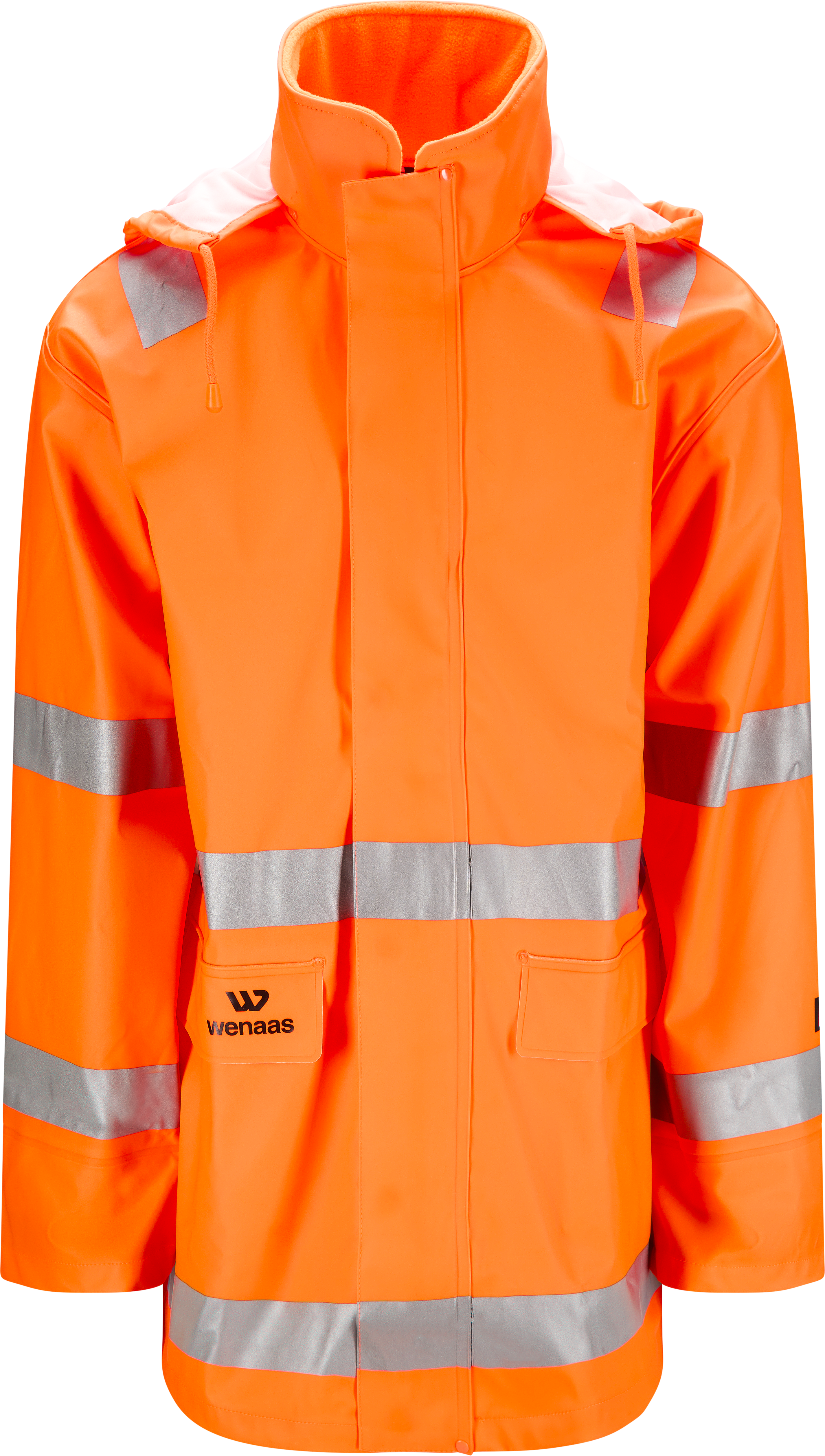 Hivis regnjacka med krage m/fleece och dold stor huva med brätte anpassad till hjälm, justering framtill, dold dragkedja under framklaff, lock stängs med plastknappar, 2 framfickor med lock och hål för dränering, svetsade sömmar, svetsförstärkning i tvärsöm under arm och ovanpå klaffarna, dolda muddar i ärmar, 2 reflexband runt ärmar, bål och över axlar.