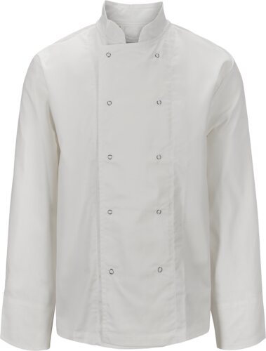 Flamskyddad kockjacka med kinakrage. Dubbelknäppt fram, delsöm på baksidan och med sprund längst ner på ärmen för att kunna vika upp ärmarna.