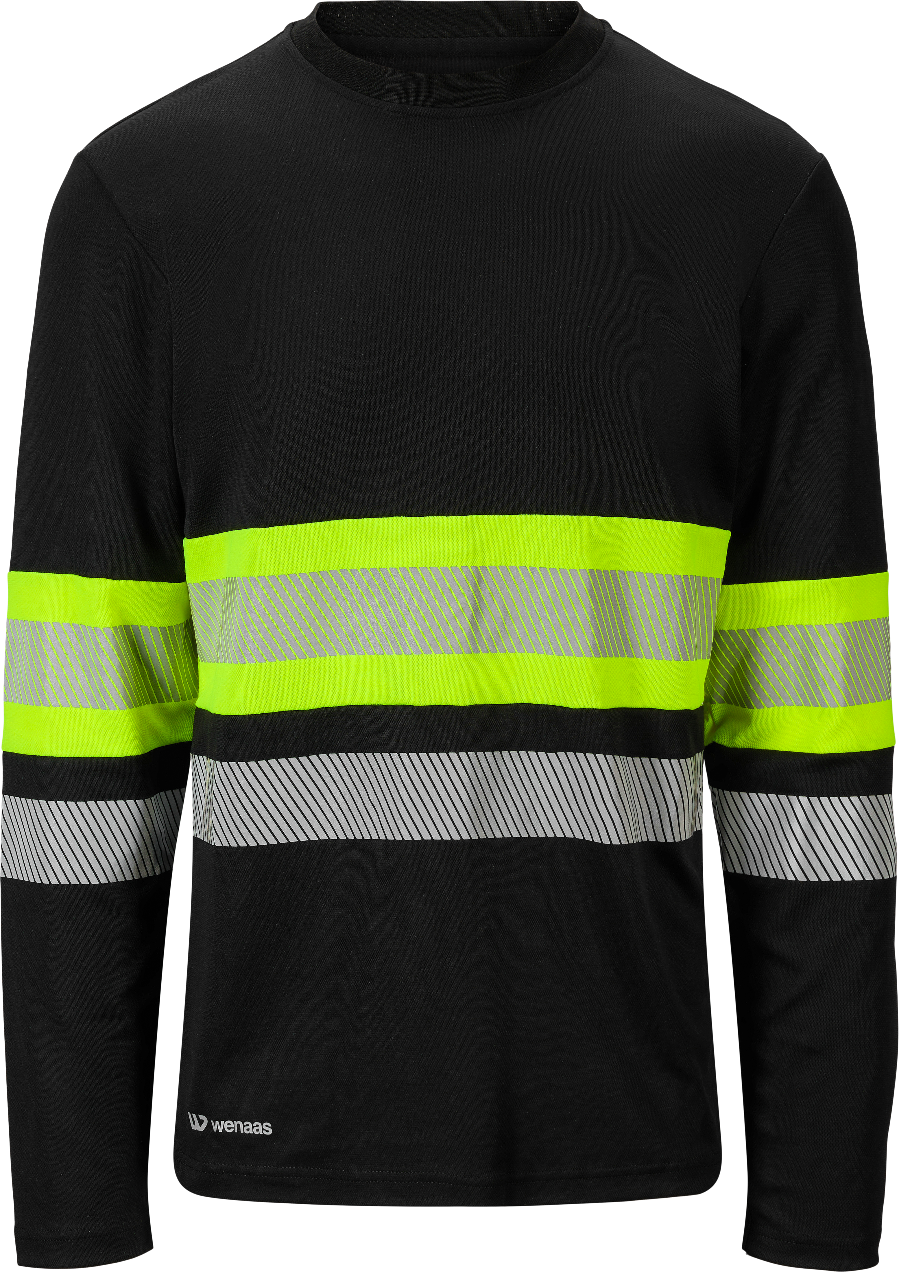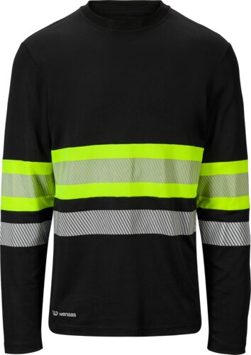 Långärmad tröja i bomull/polyester med ribbad halsringning och nackband i huvudmaterialet. HiVis-gul kontrast runt övre delen av överkroppen med segmenterat reflex i mitten av kontrastområdet och ytterligare ett reflexband strax under. Ärmarna och nederkanten har uppvikta detaljer, och övergången mellan huvud- och kontrastmaterialet är sömlös för ett stilrent utseende.