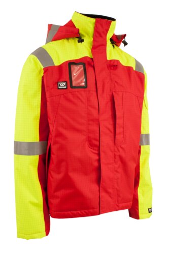 Vattentätt yttertyg, tejpade sömmar och quiltat foder, ståkrage med fleece, avtagbar huva med brätte, justering, anpassad till hjälm med kardborreknäppning fram, dold tvåvägsdragkedja under frontflik, ribb i ärmslut, stropp på bröst och hals för att fästa Regatta Freesafe flytväst (art. nr. 366-150), två bröstfickor med dragkedja under vindslå, ID-kortsficka, ärmficka med lock, två framfickor med dragkedja under lock, kartficka med dragkedja, innerficka och mobilficka, reflex på axel och ärm.