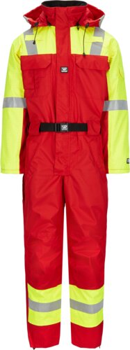 Vattentät, hållbar och flamhämmande vinteroveral med isolerande vaddering. Dold tvåvägsdragkedja fram, avtagbar huva och flera praktiska fickor. Ögla på bröst och i nacke för att fästa räddningsväst. Justeringsmöjligheter på livet och i ärm- och bensluten. Overallen passar bra för dig som ska vistas utomhus i kalla miljöer, och även behöver skydd mot eld.