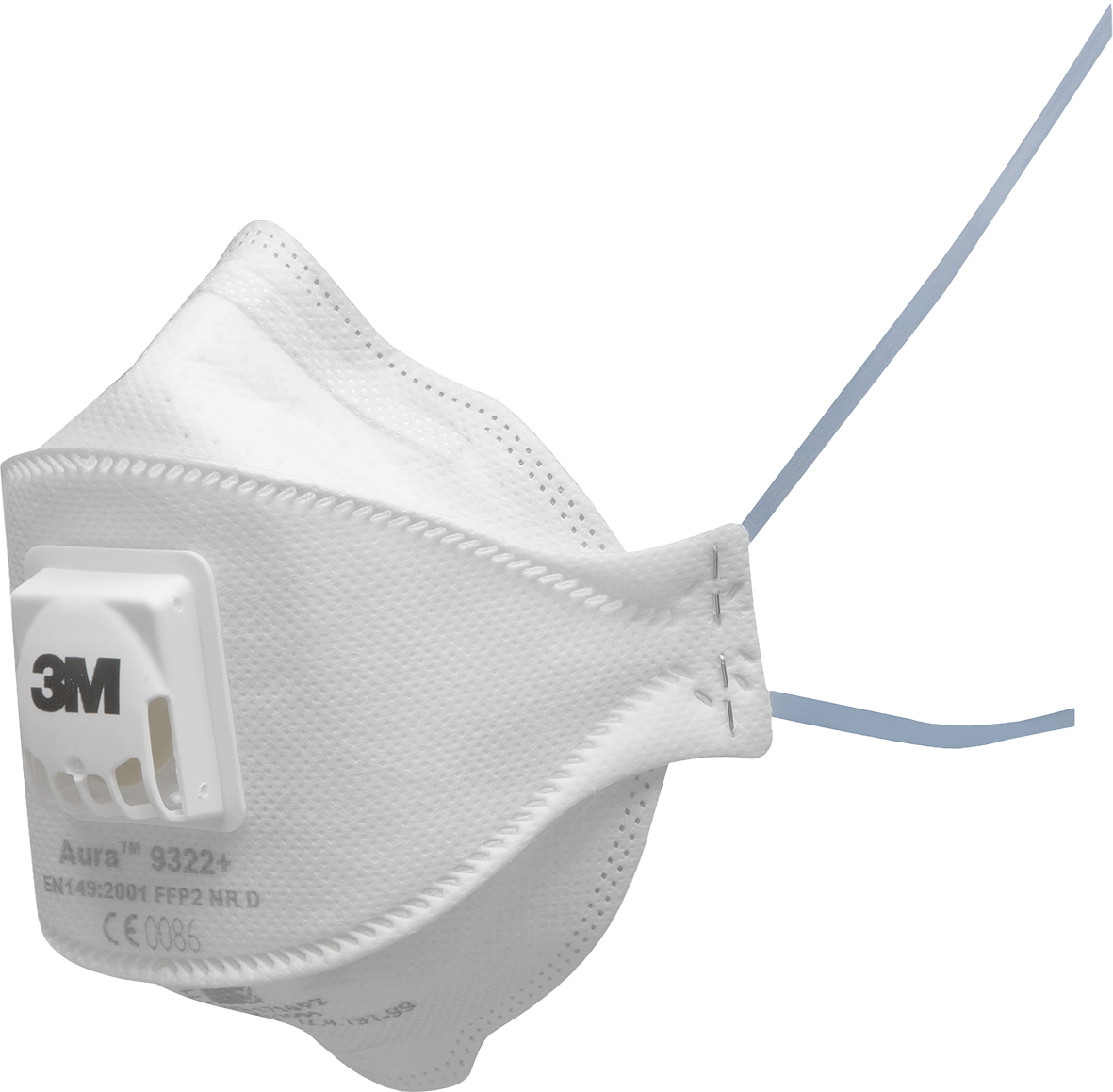 Andningsmask 3M Aura 9322+ med skyddsklass FFP2 och ventil. Filter med låg andningsmotstånd och Cool Flow-ventil som minskar värmeuppbyggnad. Ergonomisk, vikbar design med tre paneler. Den böjda övre panelen formar sig efter näsan och ansiktet och minskar imbildning på glasögon.