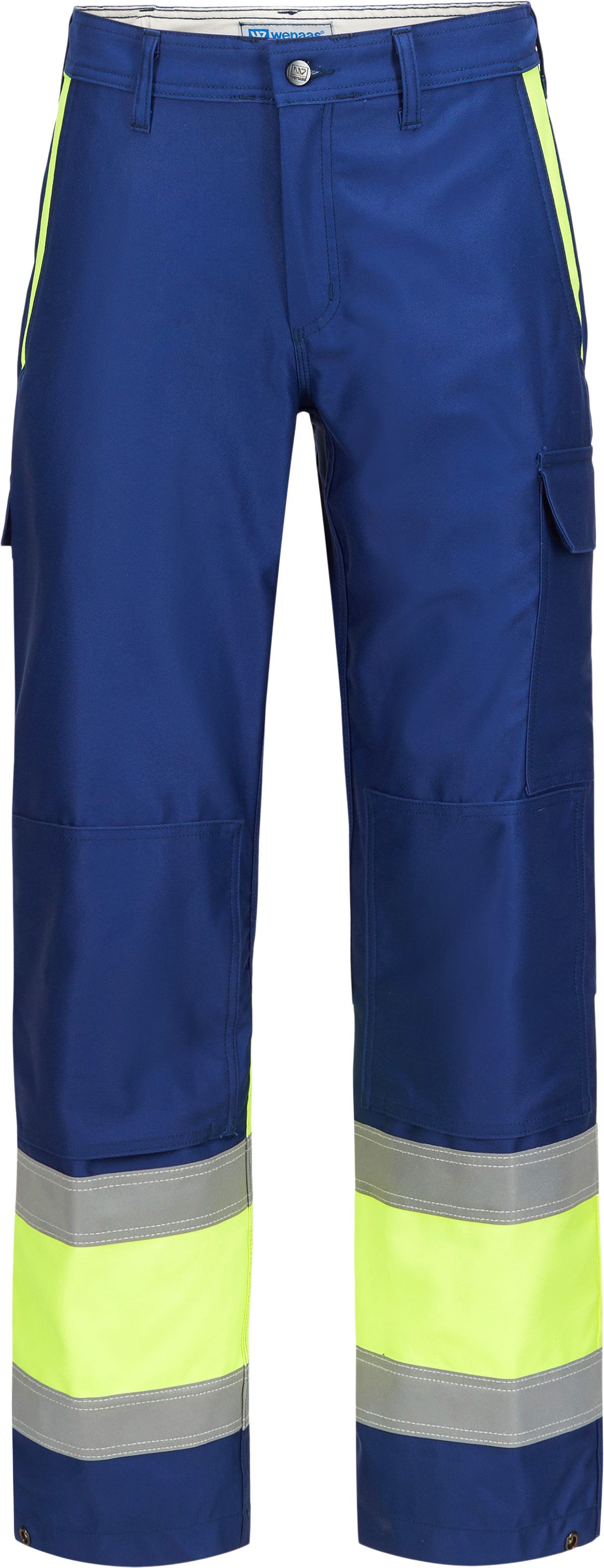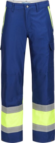 Flamhämmande byxor med resår i linningen och dold knapp; blixtlåset är dolt från in- och utsidan i gylfen, byxorna har kilar för bättre rörlighet, två isticksfickor fram, två bakfickor med flik, tumstocksficka, lårficka med flik, knäskyddsfickor med 14 cm öppning nedtill, dold tryckknapp för justering av vidden i benslutet, reflexband runt benen.