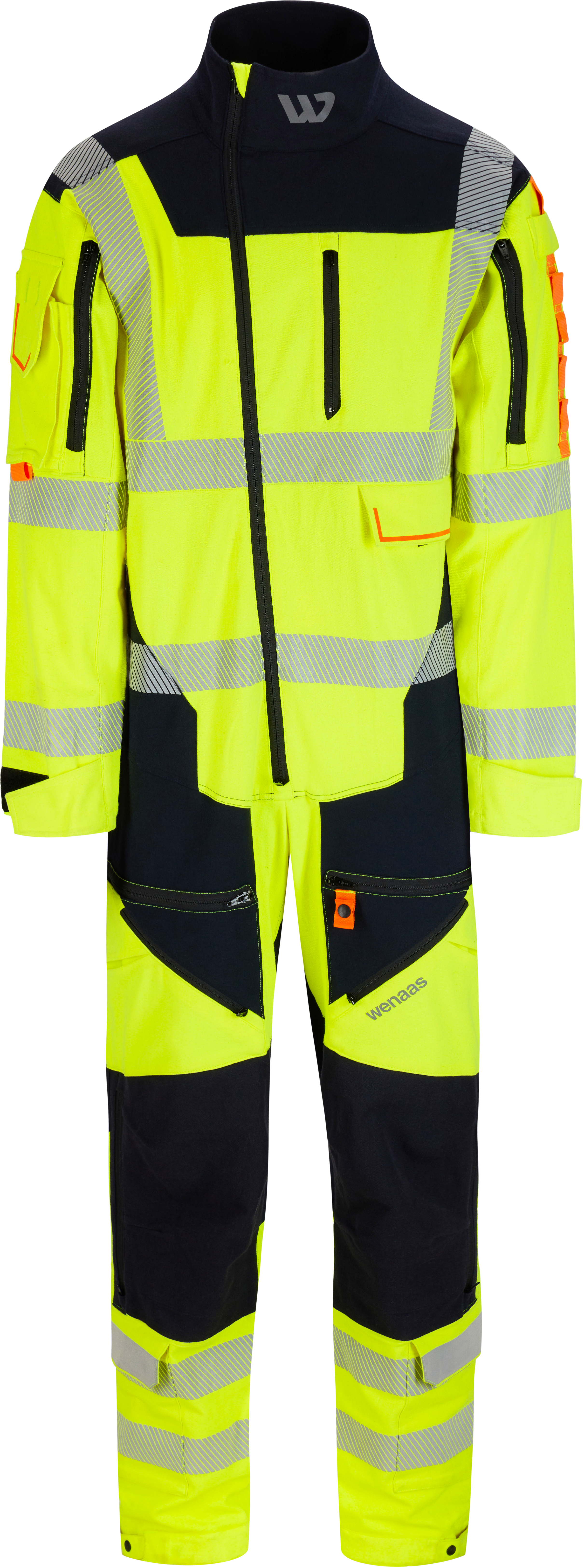 Multinorm klätteroverall klass 3, ståkrage, långt blixtlås fram upp till toppen av kragen, flikar som täcker blixtlåset över och under, bröstficka vänster sida med blixtlås, en framficka med flik och öppning för tillgång till underkläder, lårfickor med blixtlås, vävband med D-ring för ID-korthållare, stora ärmfickor med blixtlås, höger sidoficka har radioficka med flik och vävband i nederkanten av fickan och två knapphål på toppen, vänster ärmficka har en radioöppning och en vertikal vävbandsstropp med fyra öppningar för upphängning av verktyg, lårfickor med flik, ventileringsöppning med blixtlås vid knät, knäskyddsfickor för två nivåer, justerbara ärmar och ben. Reflexband på kropp, axlar, ärmar och ben.