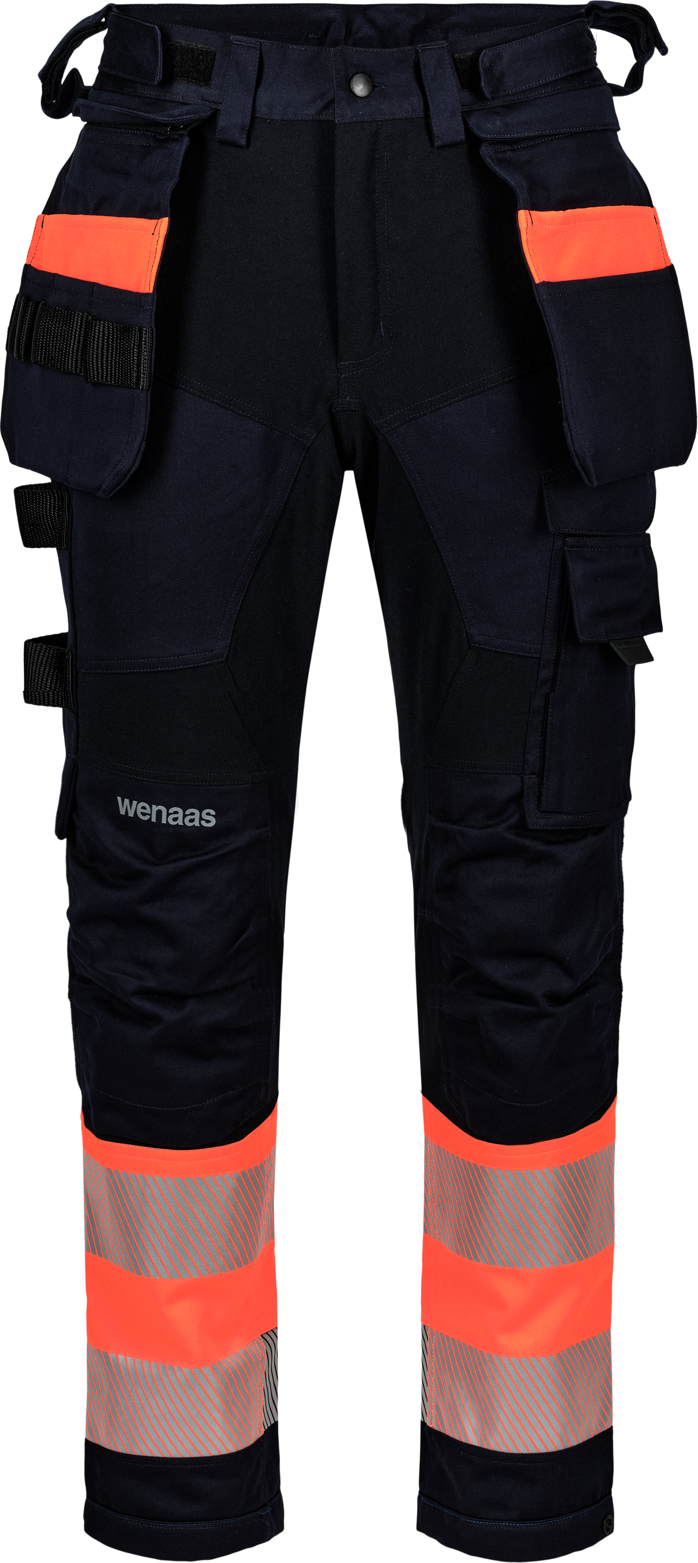 Multinorm stretchbyxor, klass 2, D-fig, med ryggok, justerbar linning med extra höjd bak, stora bälteshällor, hammarslinga på båda sidor, knapp och dragkedja fram, sidofickor med dragkedja, stora avtagbara verktygsfickor, verktygsslingor, lårficka med utvändig ficka, båda täckta med lock, tumstocksficka med knivknapp, hammare och knivslöng, bakfickor med mesh-ventilation och lock, knäskyddsfickor med två nivåer, dubbel reflextejp på benen, justerbar benvidd, 4-vägs stretch.