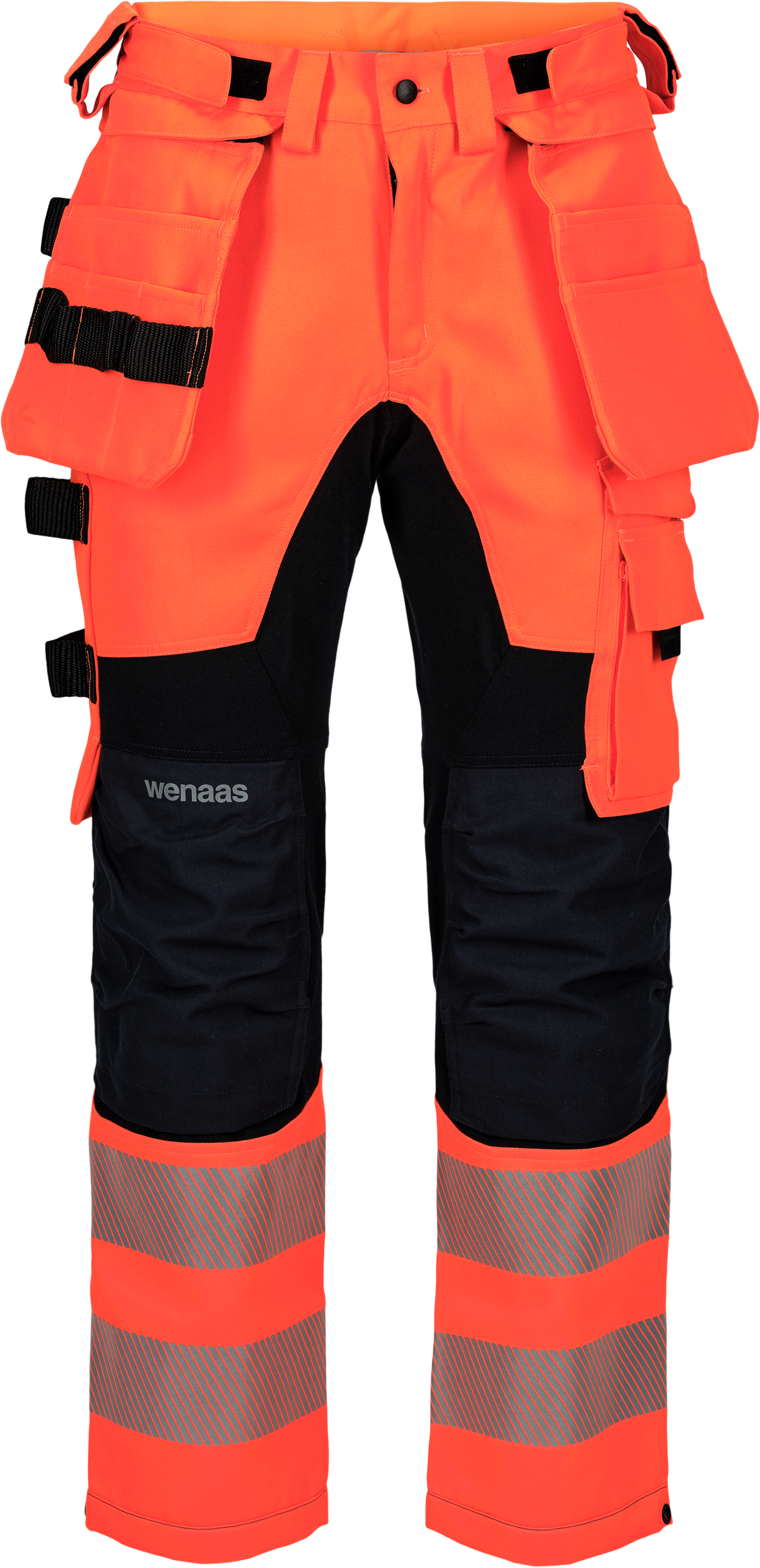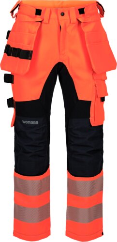 Multinorm stretchbyxor dam, bärstycke bak, justerbar linning som är extra hög mitt bak, stora bälteshällor, hammarögla på varje sida, knapp och blixtlås fram, sidofickor med blixtlås och ventilerande mesh, stora avtagbara multi-verktygsfickor med utvändiga nät-verktygshällor, lårficka med utvändig ficka, båda täcks av en flik, tumstocksficka med knivögla, hammar- och knivögla, bakfickor med ventilerande mesh och flik, knäskyddsfickor för två nivåer, dubbel reflex på benet, justerbar benvidd, 4-vägs stretch.