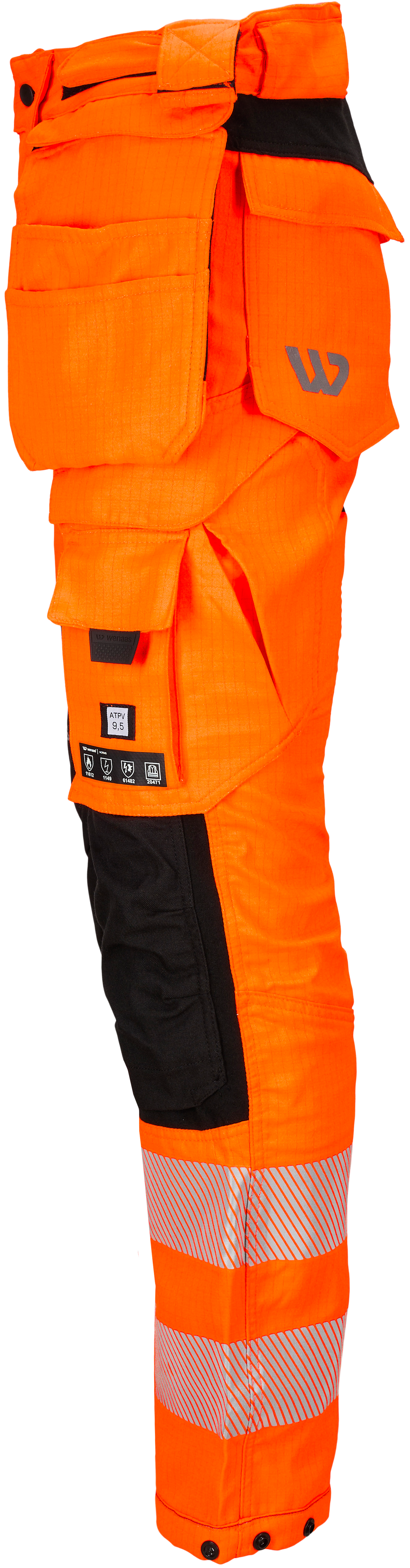 Multinorm stretchbyxor klass 2, bärstycke bak, justerbar linning som är extra hög mitt bak, stora bälteshällor, hammarögla på varje sida, knapp och blixtlås fram, sidofickor med blixtlås och ventilerande mesh, stora avtagbara multi-verktygsfickor med utvändiga nät-verktygshällor, lårficka med utvändig ficka, båda täcks av en flik, tumstocksficka med knivögla, hammar- och knivögla, bakfickor med ventilerande mesh och flik, knäskyddsfickor för två nivåer, dubbel reflex på benet, justerbar benvidd, 4-vägs stretch.