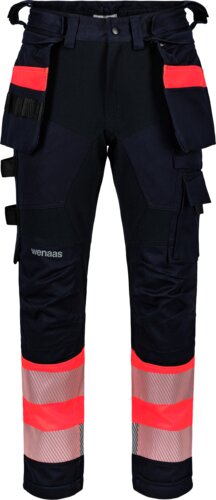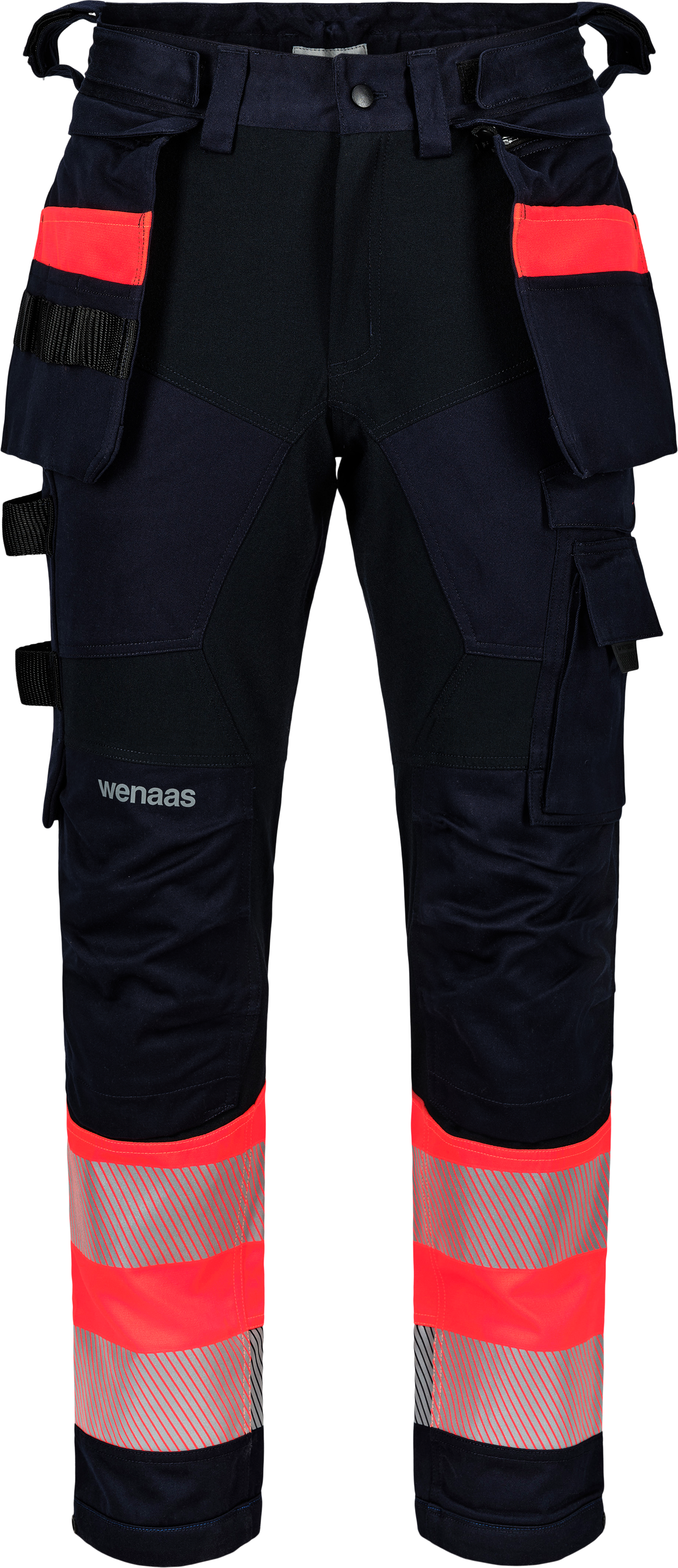 Multinorm stretchbyxor, bärstycke bak, justerbar linning som är extra hög mitt bak, stora bälteshällor, hammarögla på varje sida, knapp och blixtlås fram, sidofickor med blixtlås och ventilerande mesh, stora avtagbara multi-verktygsfickor med utvändiga nät-verktygshällor, lårficka med utvändig ficka, båda täcks av en flik, tumstocksficka med knivögla, hammar- och knivögla, bakfickor med ventilerande mesh och flik, knäskyddsfickor för två nivåer, dubbel reflex på benet, justerbar benvidd, 4-vägs stretch.