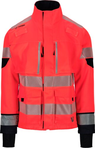 Multinorm stretchjacka, ståkrage, blixtlås fram upp till toppen av kragen dolt under en frontflik, 4-vägs stretchpaneler, radiohällor, en bröstficka med blixtlås, och med smala vertikala reflexränder, dubbla framfickor, en invändig kartficka och en mobiltelefonficka, ärmar med förstärkning på armbågarna, ribbstickade manschetter med tumgreppsöppning längst ner på ärmarna, justerbar linning, två reflexband på ärmar och kropp, och ett vid axlarna.