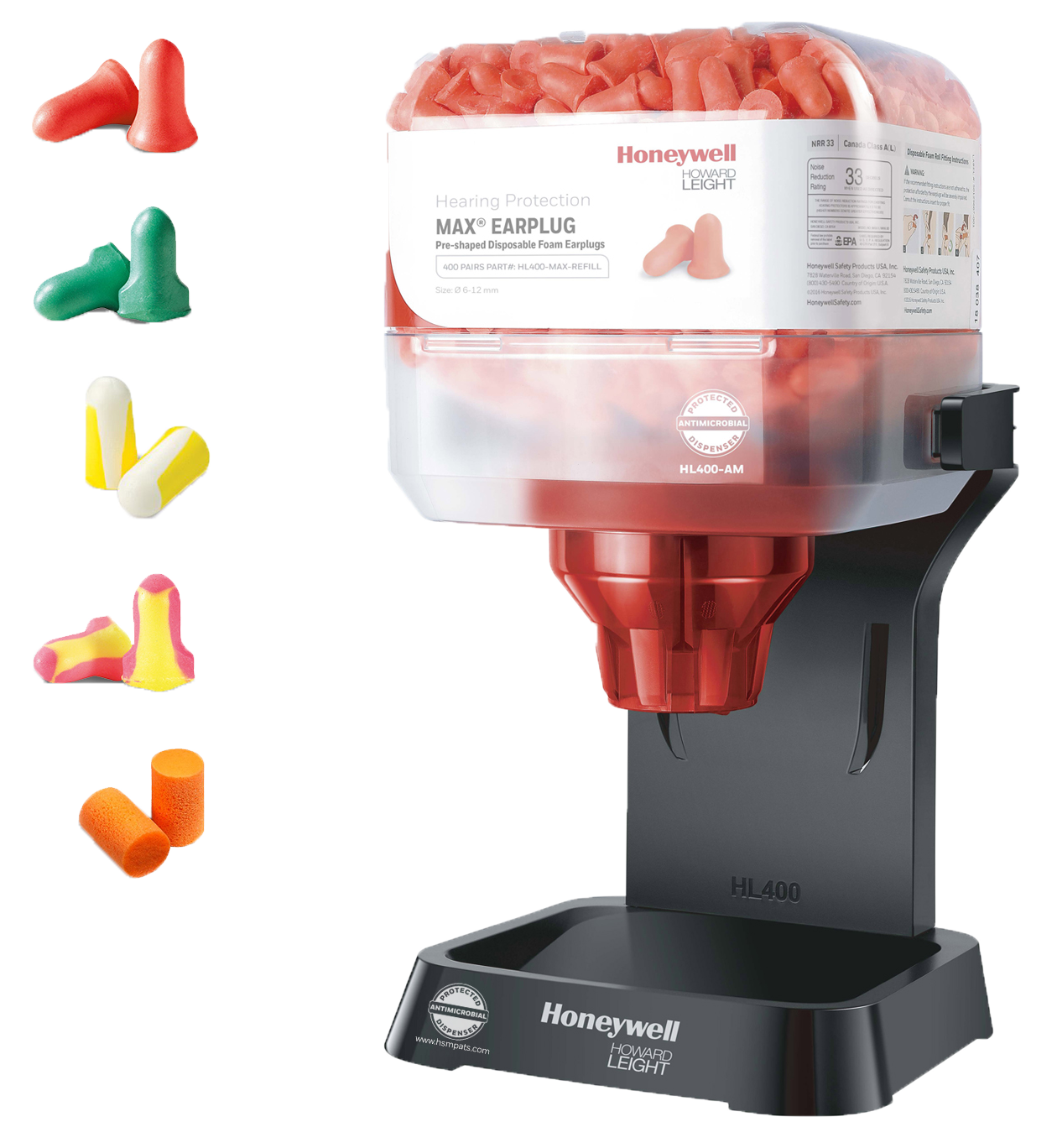 Dispenser med 400 par Howard Leight Max öronproppar, klockformade, minimerar tryck, glider inte ur hörselgången, slät yta, dispensern kan monteras på vägg/bord/används fristående. Enkel vridomkopplare med 180° åtkomst, platta under.