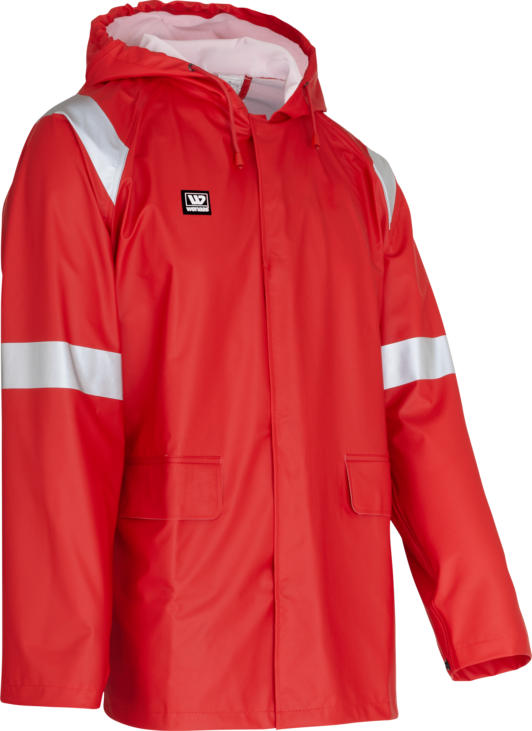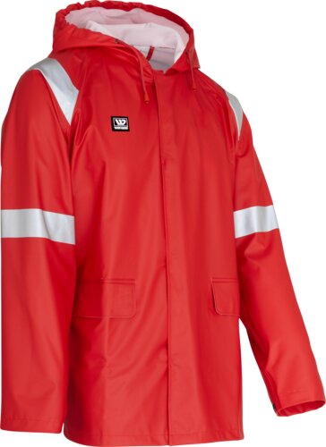 Regnjacka med huva med justering, knappstängning fram med dubbelt lock och två framfickor med lock. Justering i ärmslut. Reflex på axlar och ärmar
