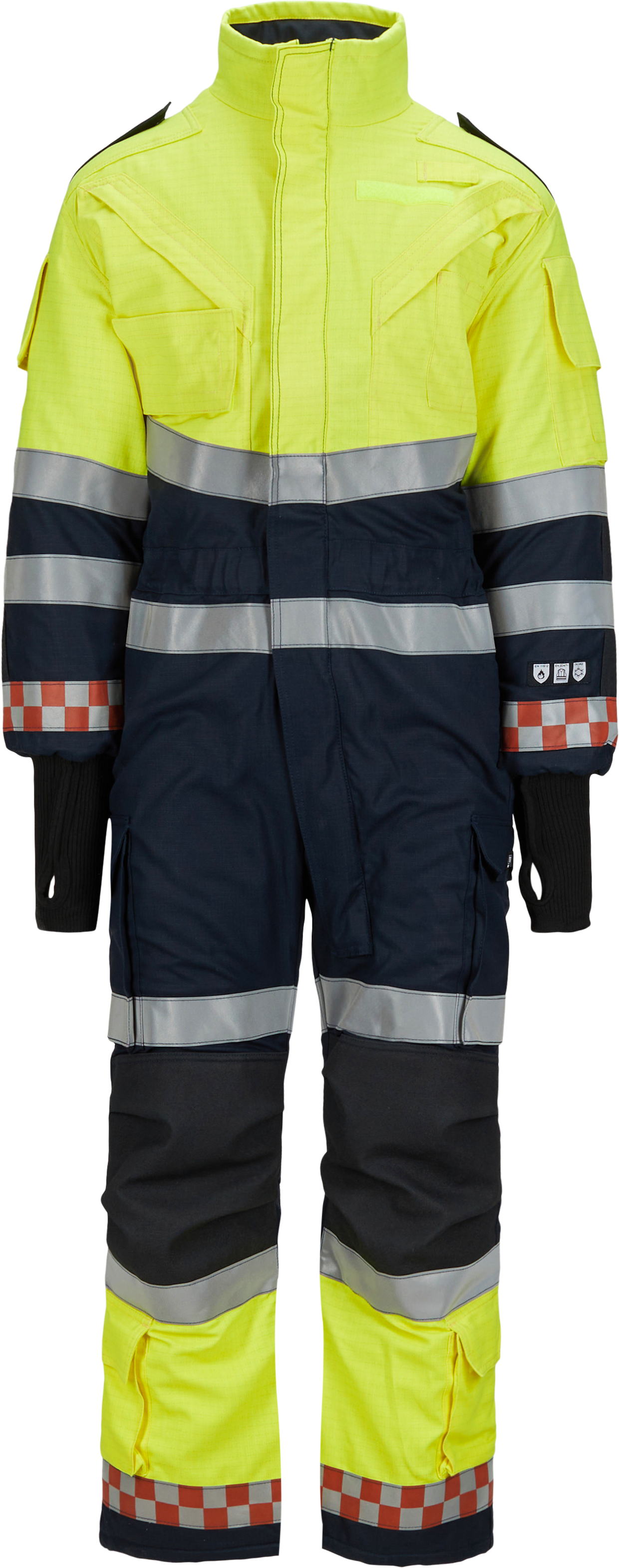 Hållbar, varm och flamhämmande räddningsoverall med förlängd tvåvägsdragkedja fram. Hög krage, axlar med klaff och vaddering samt veck i ryggen för bättre rörlighet. Avtagbara byxhängslen, hållare för radioantenn och många praktiska fickor. Formsydd armbåge och knä med Aramid-förstärkning. Det vadderade fodret gör overallen varm och skön. Möjligheter att justera i livet gör att plagget sitter bra. Justeringsmöjligheter i ärm- och benslut. Overallen passar bra för dig som ska vistas ute i kylan i synnerhet inom brandförsvaret och räddningstjänsten.Visa mindre