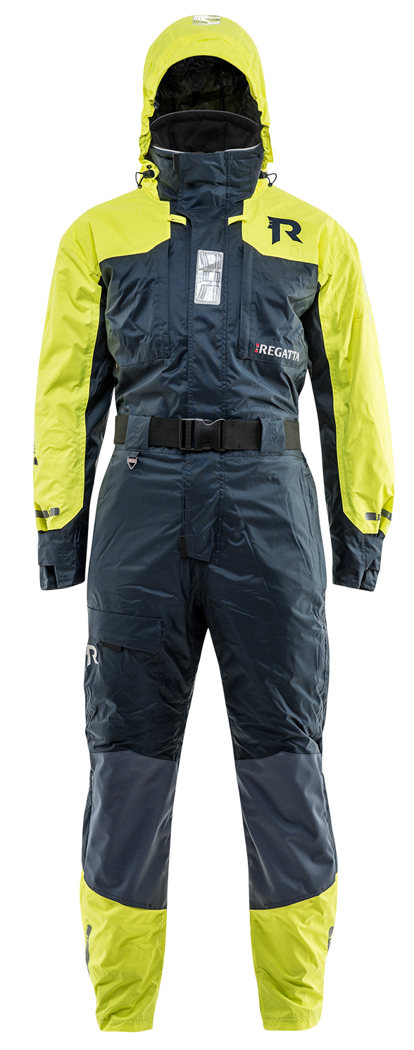 Flytdräkt, synlig vid dåliga ljusförhållanden, praktiska ficklösningar, bälte, hög krage med inrullningsbar huva, förstärkning på knän samt bak, invändiga hängslen