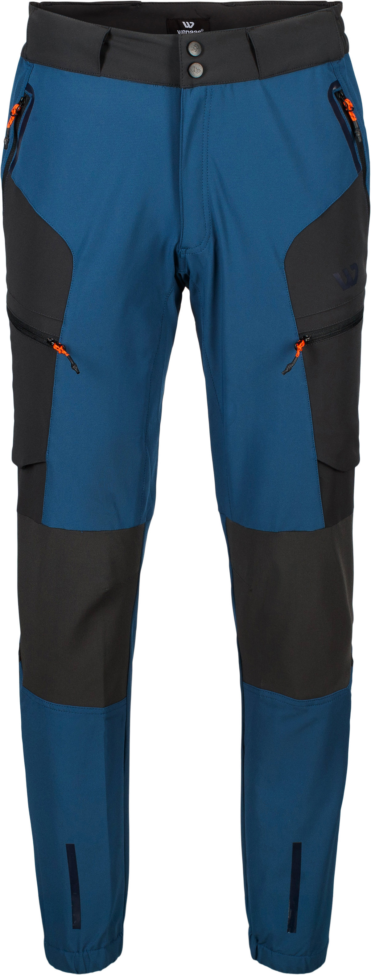 Softshellbyxorna är tillverkade av två olika typer av elastiskt material och har en linning med resår på sidorna, 4 stora bälteshällor, gylf med dragkedja och tvåknappsstängning fram. Slits bak på båda sidor, kil i grenen, två stora sidofickor med dragkedja, två stora framfickor med dragkedjor och extra justeringsmöjlighet nederst på fickan. Förstärkningstyg fram på knät, små ventilationshål på baksidan av knät. Dragkedja på benen för justering av benvidden. Reflexdetaljer.