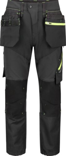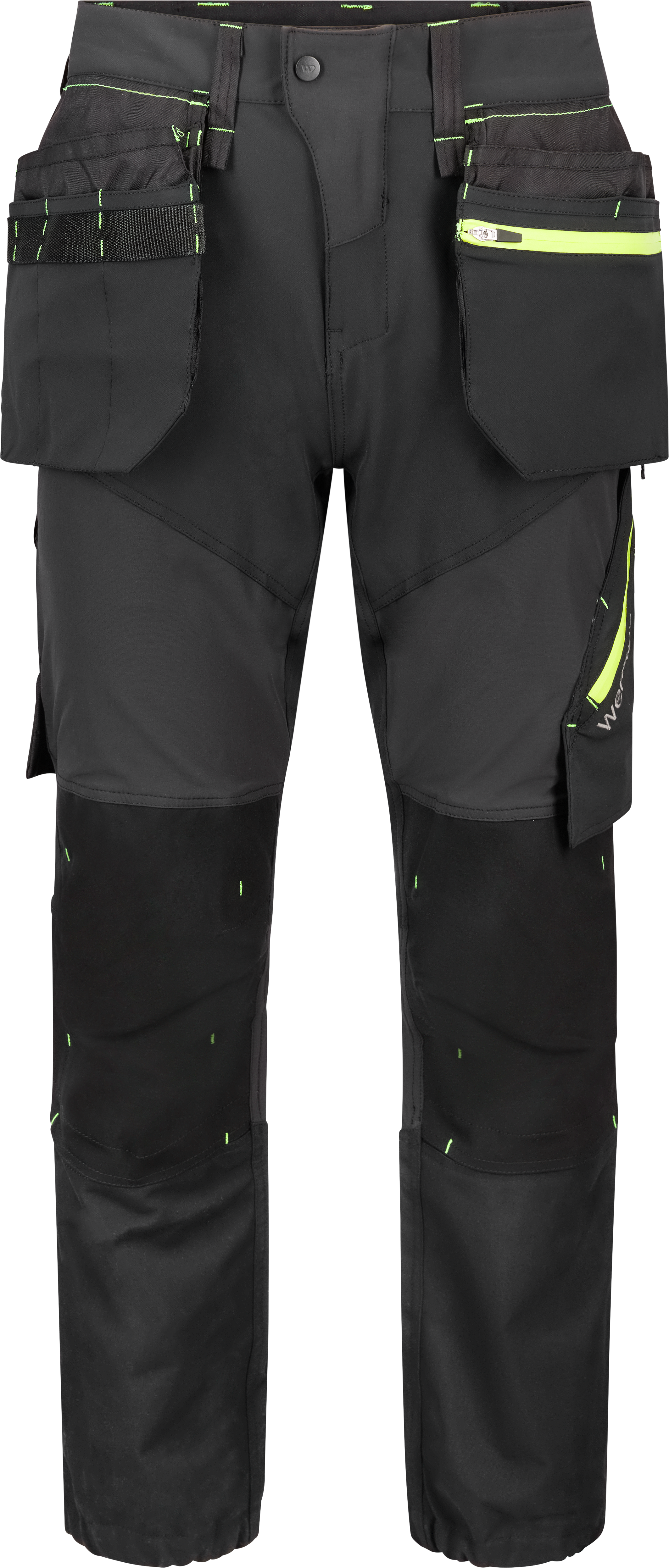 Bekväma stretchbyxor i 4-vägsstretch. Resår i midjan, dragkedja framtill och flera praktiska fickor. Moderna arbetsbyxor med neongula detaljer och resår nedtill på benen.