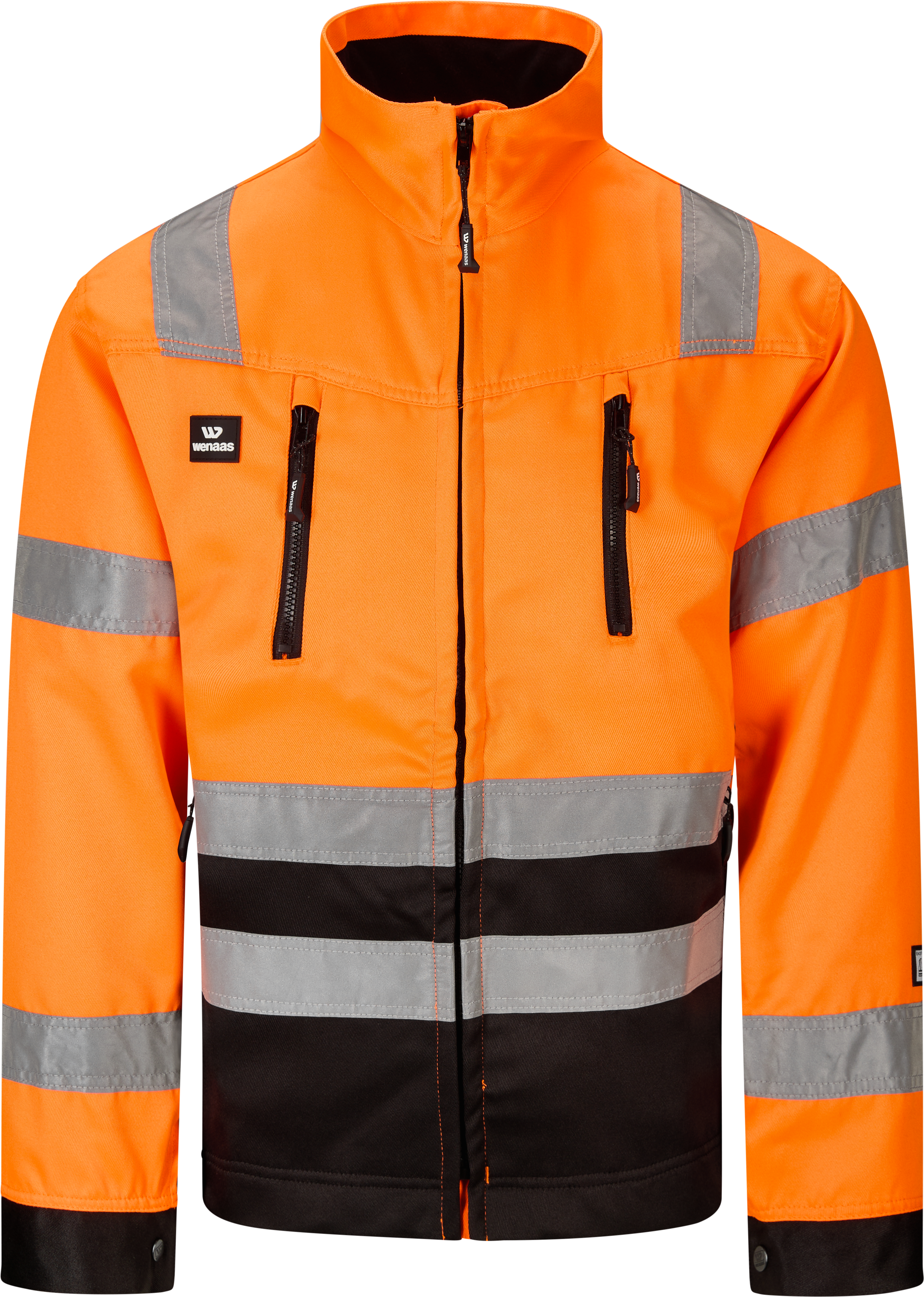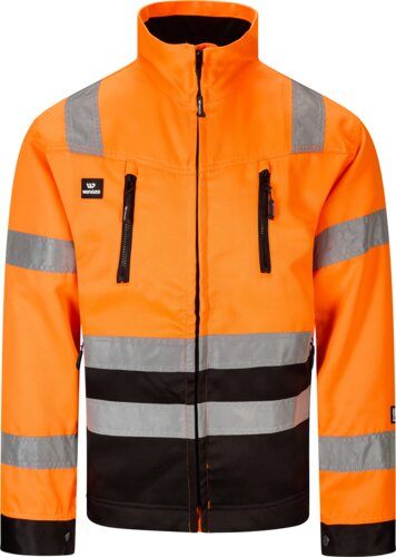 Hi-vis-jacka med upprättstående krage fodrad med fleece, dragkedja framtill, fram- och bakstycke och förlängd rygg. Bröstfickor med dragkedjor, framfickor med dragkedjor, en med inre mobilficka, två stora inre fickor, och en med extra ficka med knappstängning. Kil i ärmarna, justerbara manschetter med tryckknappar. Tryckknappar i midjan för breddjustering och reflex över axlarna, ärmarna och runt överkroppen.