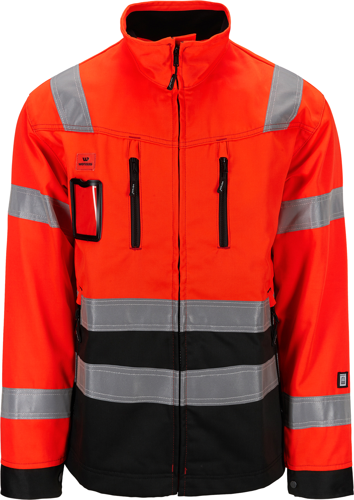 Hi-vis-jacka med upprättstående krage fodrad med fleece, dragkedja framtill, fram- och bakstycke och förlängd rygg. Bröstfickor med dragkedjor, framfickor med dragkedjor, en med inre mobilficka, två stora inre fickor, och en med extra ficka med knappstängning. Kil i ärmarna, justerbara manschetter med tryckknappar. Tryckknappar i midjan för breddjustering och reflex över axlarna, ärmarna och runt överkroppen.