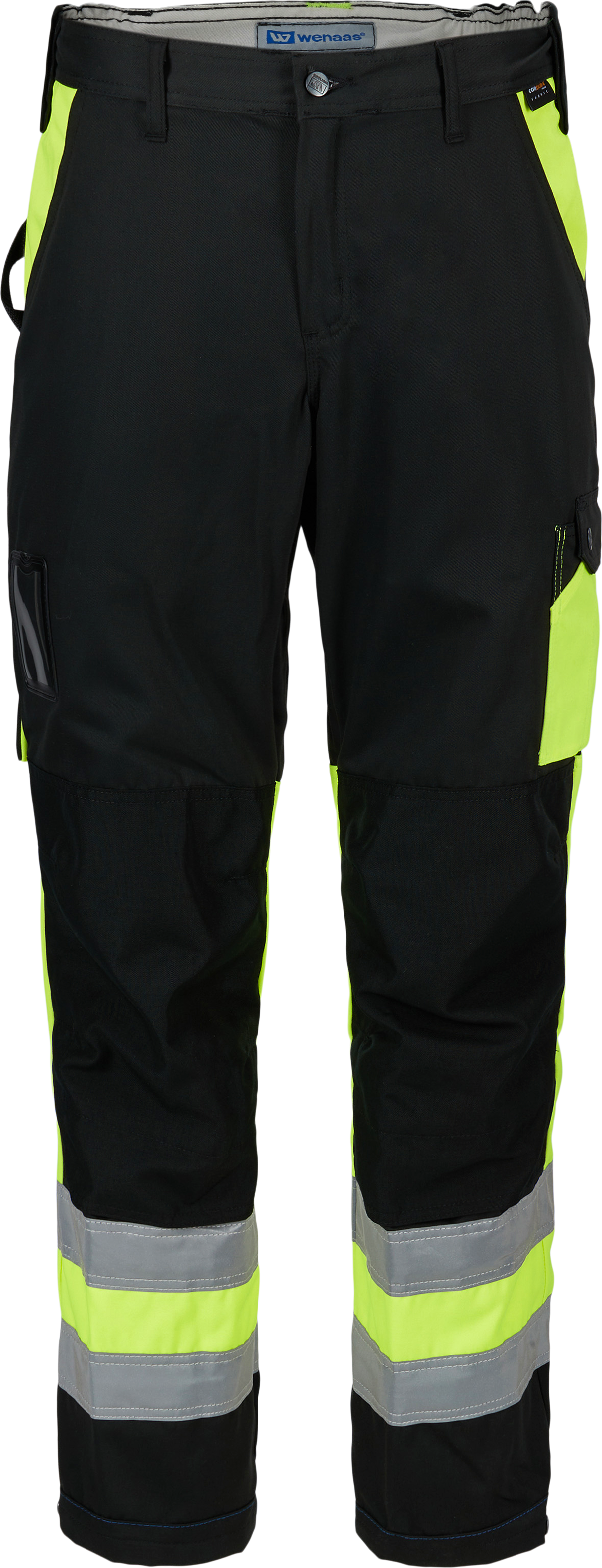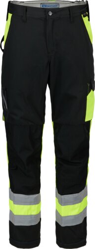 Slitstarka byxor godkända för synbarhetsklass 1. Med linning, bälteshällor, hammarlökor, gylf med dragkedja och gren för rörelsefrihet. Praktiska fickor som tumstocksficka med hammarlök och knivhållare, dubbel höftficka med lock och knäfickor i två nivåer. Justerbar benvidd och längd, dubbel reflex runt benen. Förstärkta med Cordura på utsatta områden.