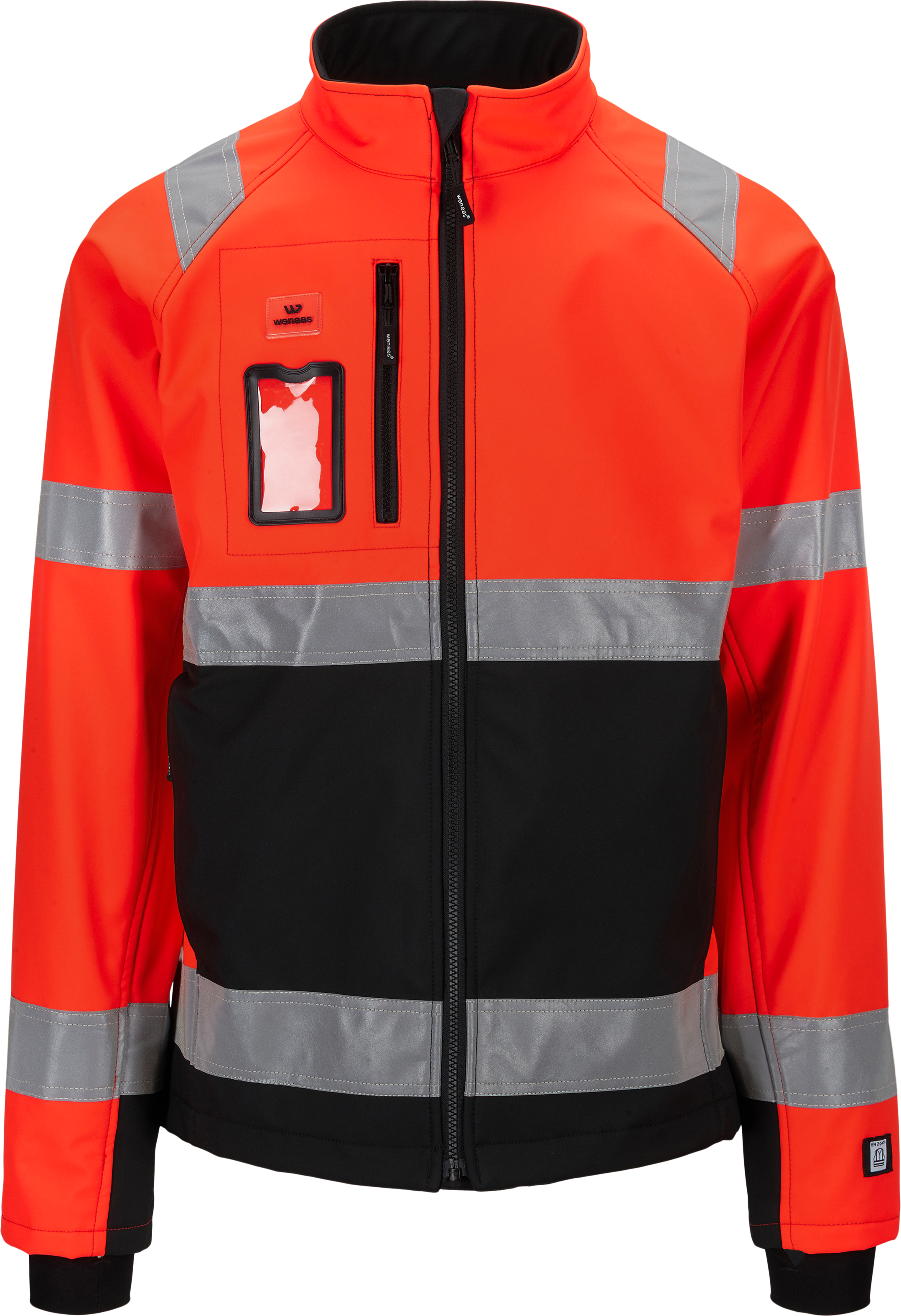 Hivis softshell-jacka i vind- ock vattenavvisande material med fleecefoder, dragkedja fram, reflex på axlar, ärmar och kropp, elastisk manschett med tumgrepp, två sidofickor med dragkedja, bröstficka med dragkedja och raglanärmar, infällt parti i svart på ärmslut, förlängt ryggstycke.