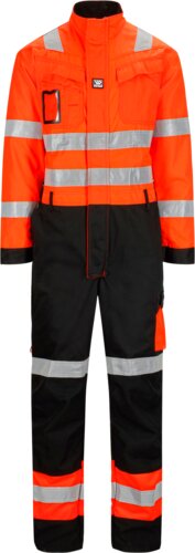 Hivis overall med reflex över axlar, runt ärmar, ben och bål och extra reflex över låren, tvåvägsdragkedja fram hela vägen upp till kragens överkant gömd bakom en klaff som stängs med kardborre, sidfickor med handtag, två bröstfickor med lock, högerficka med ID-ficka och pennficka, verktygshållare i sidan i Cordura, bakficka på höger sida med tumstocksficka som inte fästs i botten, knapp för knivslida och vävt band, pennficka, hammarögla mellan bakficka och sidsömmar på höger sida, lårficka med lock och mobilficka samt en mindre ficka, utvändiga knäfickor i Cordura i två höjder, justerbar mudd med kardborre, kil i ärmen, expansionsflik ryggen, resår bak försedd med bälteshällor, tryckknappsjustering längst ner på benen, cordura längst ner på benen