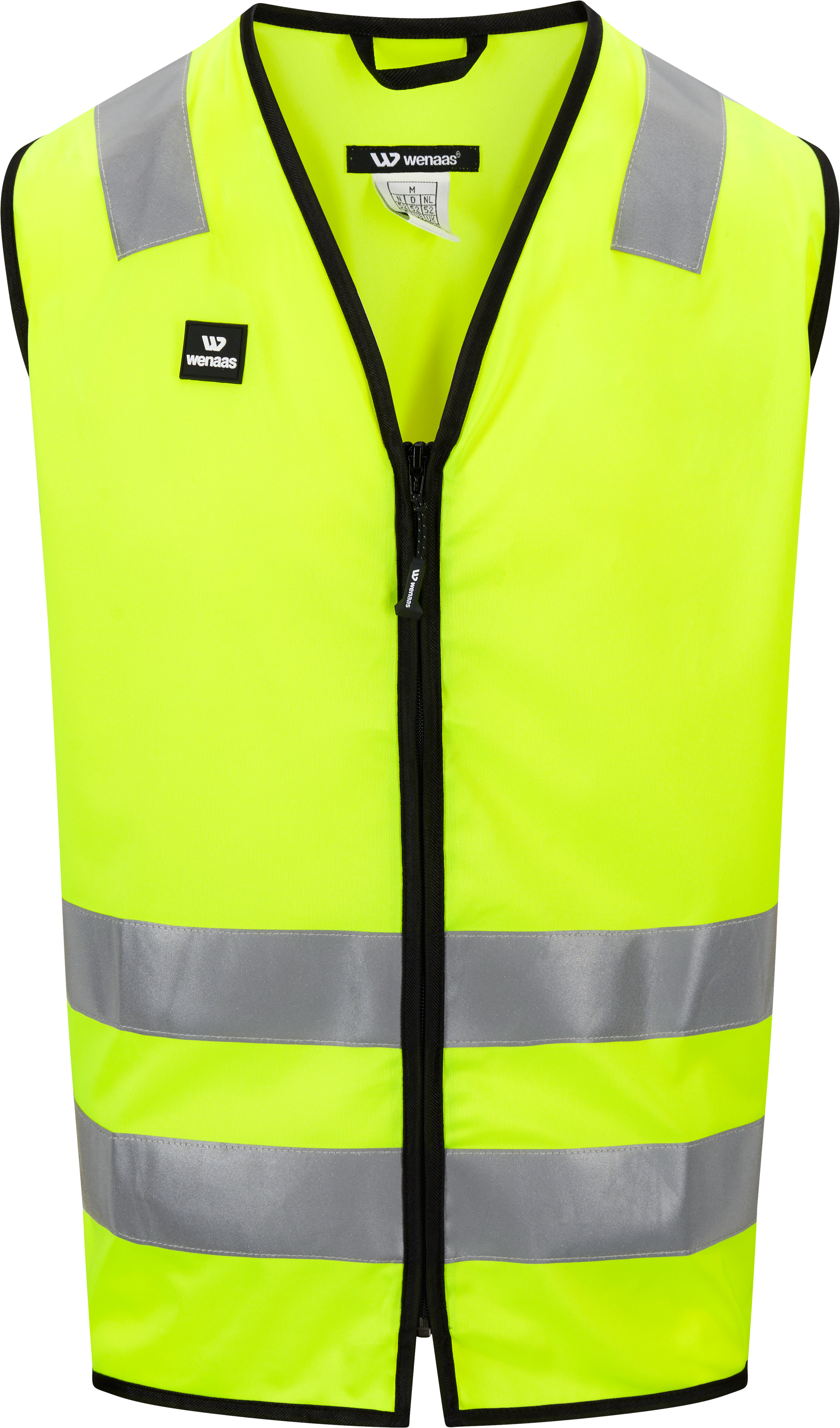 Hivis reflexväst med reflex över axeln, två reflexränder runt bålen, dragkedja framtill.