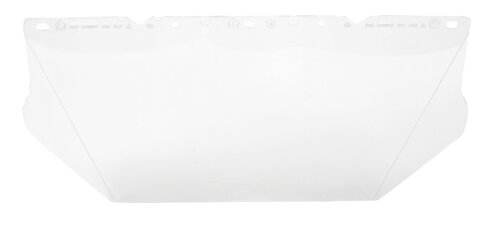 Klart polykarbonat visir. Skyddar mot stötar, vätskestänk og smält metall. Tjocklek 1,5 mm. 203x432 mm. Vikt 145 g. Måste kombineras med MSA visirhållare, och fästas i 30 mm spår på hjälm eller på hörselskydd. Förpackning: 10 st.